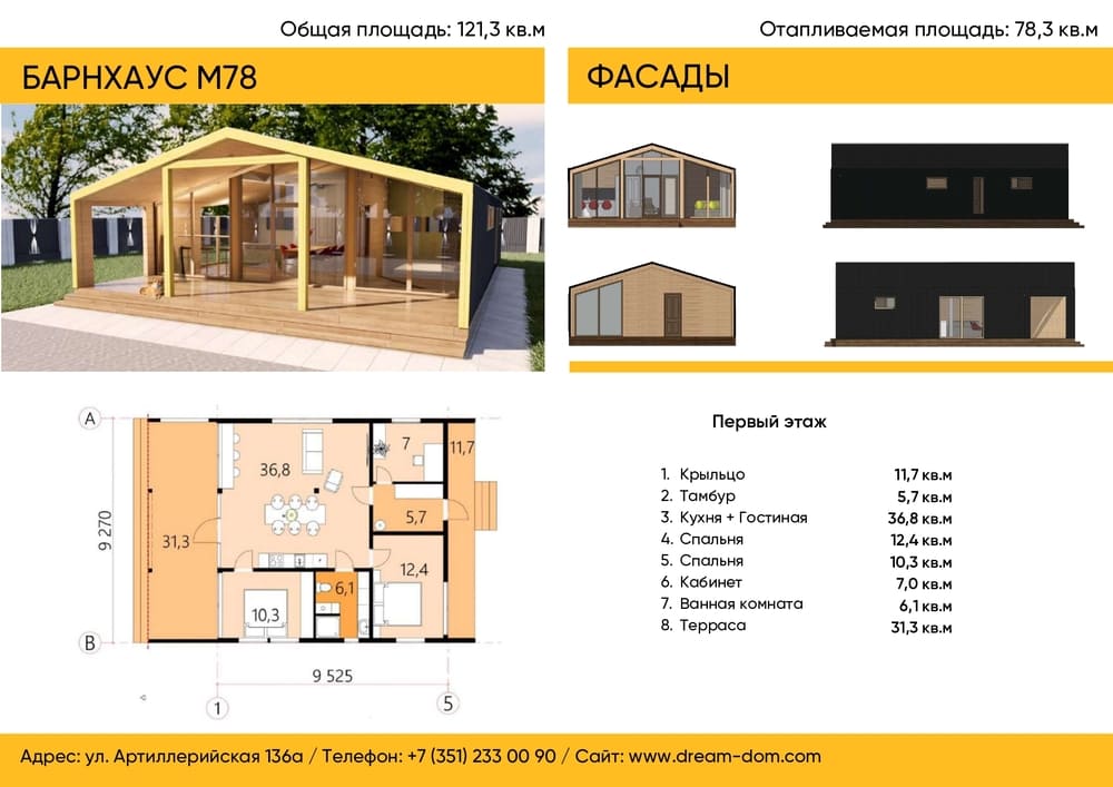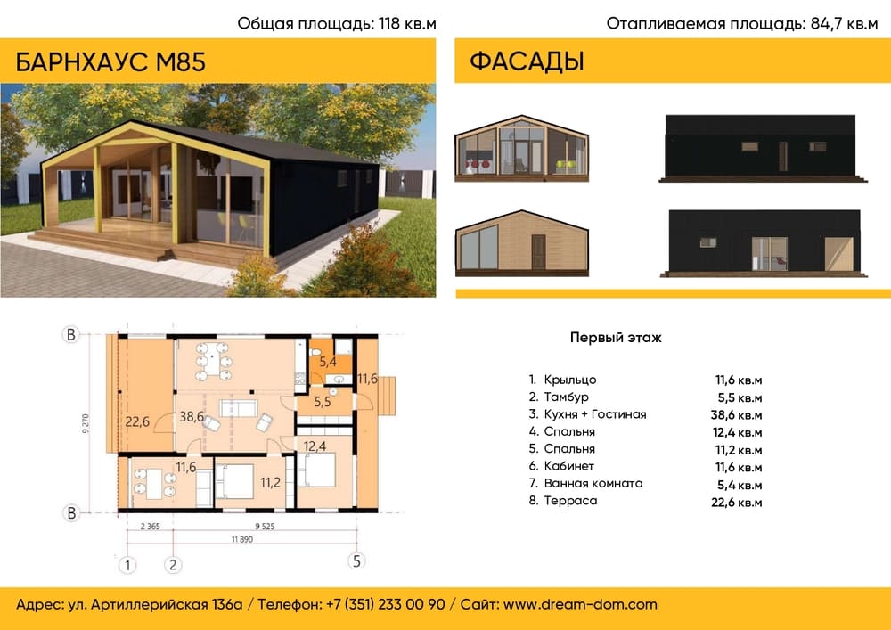 Одноэтажный дом с жилым антресольным этажом и «вторым светом» в области студии. Спроектирован в современной архитектуре с панорамными окнами, предназначен для проживания семьи из трех человек.