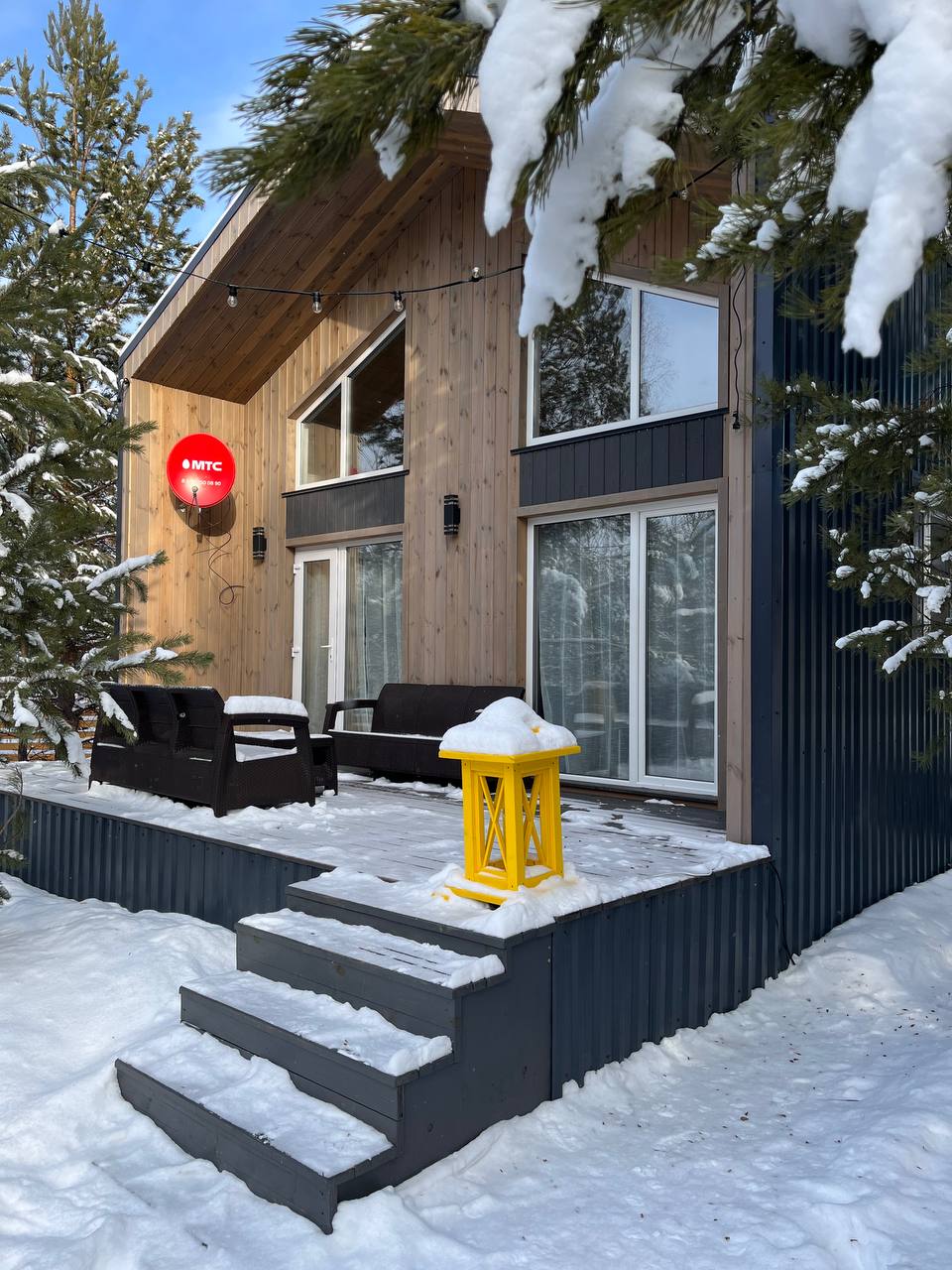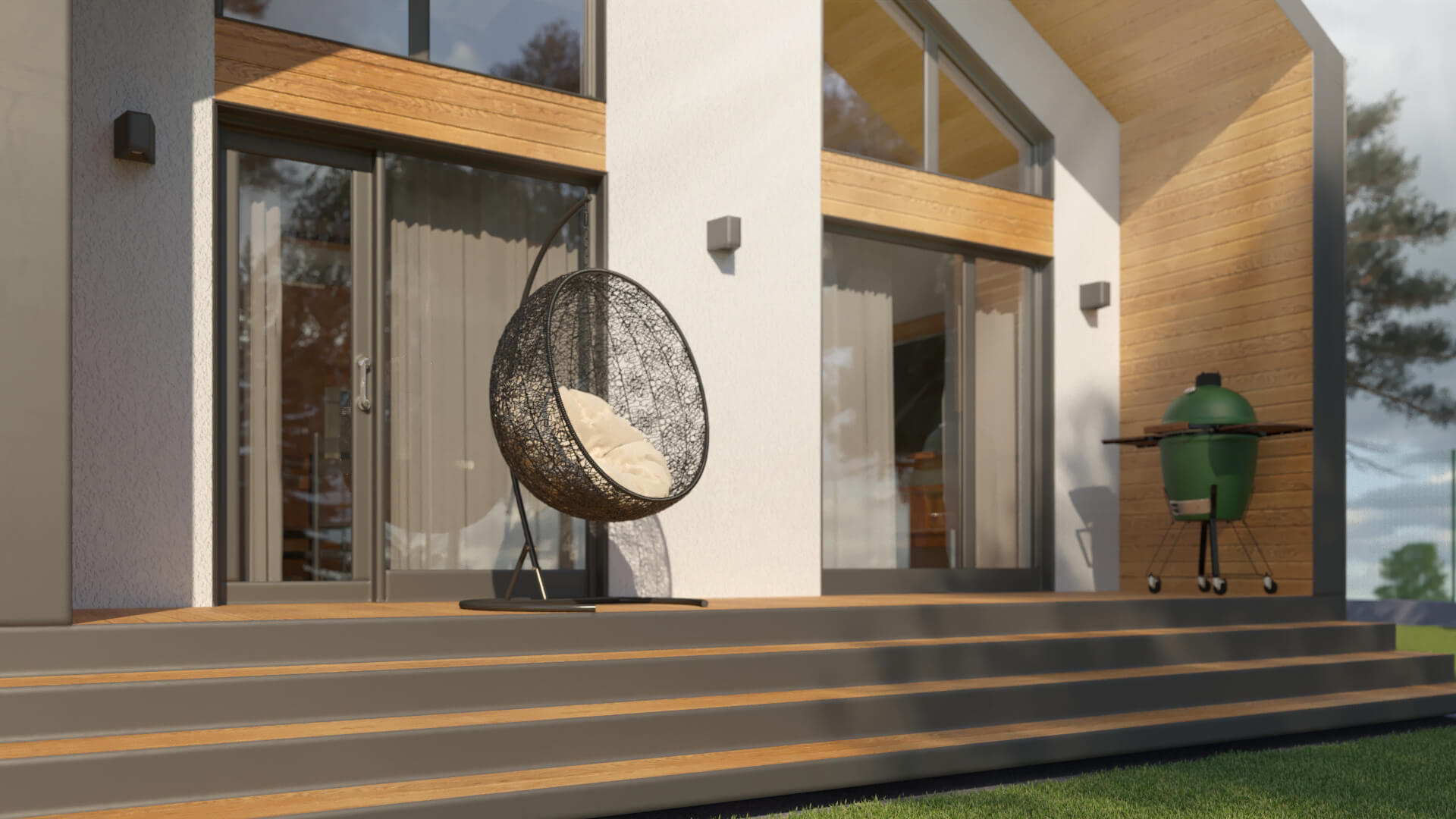 Одноэтажный дом с жилым антресольным этажом и «вторым светом» в области студии. Спроектирован в современной архитектуре с панорамными окнами, предназначен для проживания семьи из трех человек.