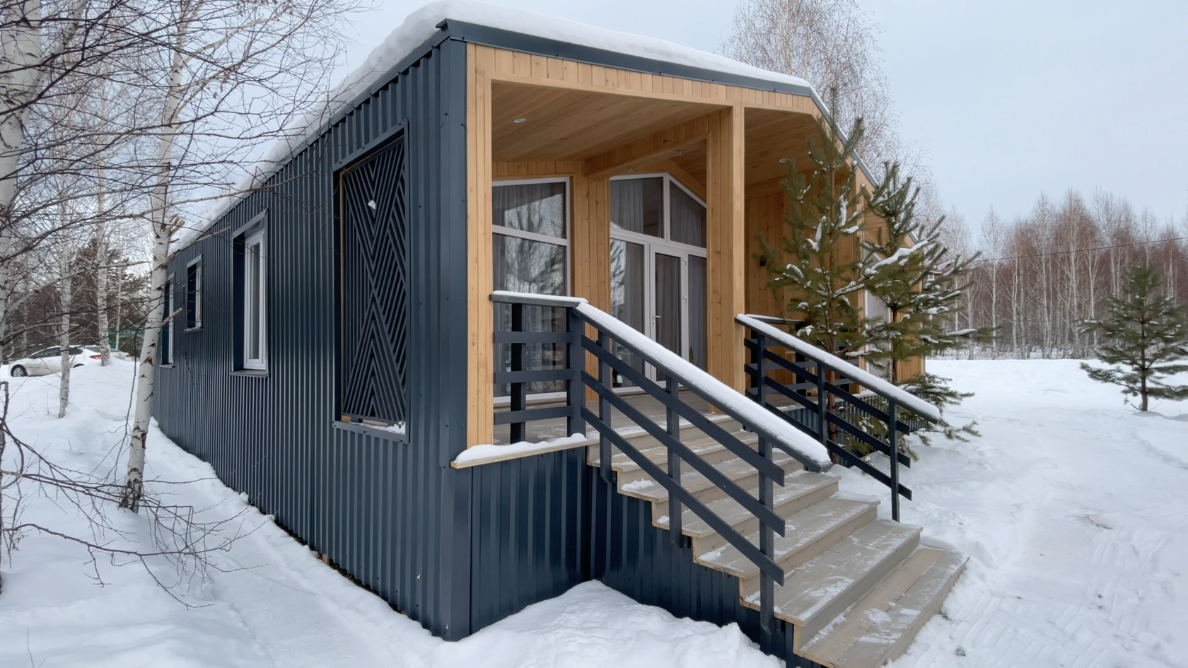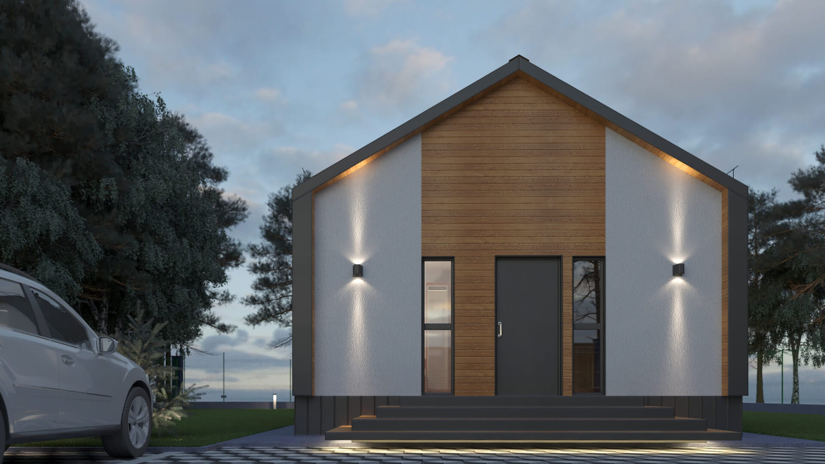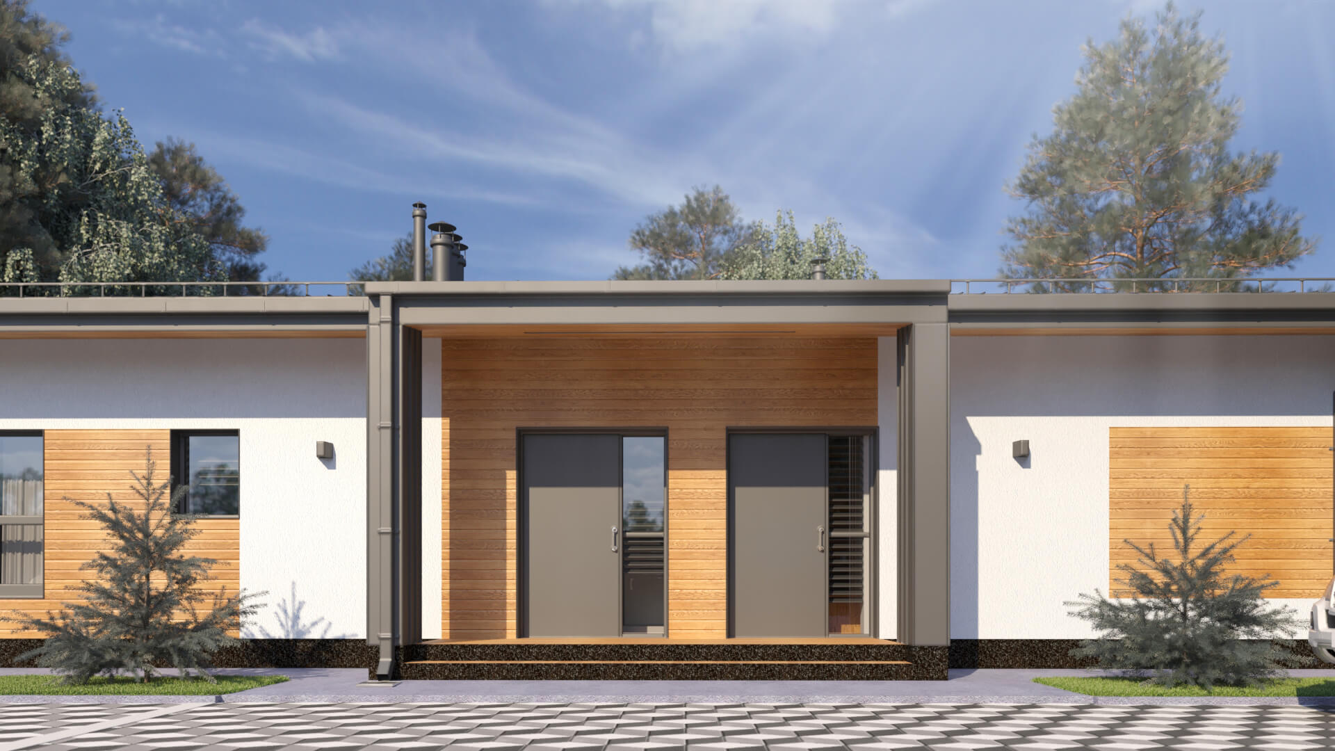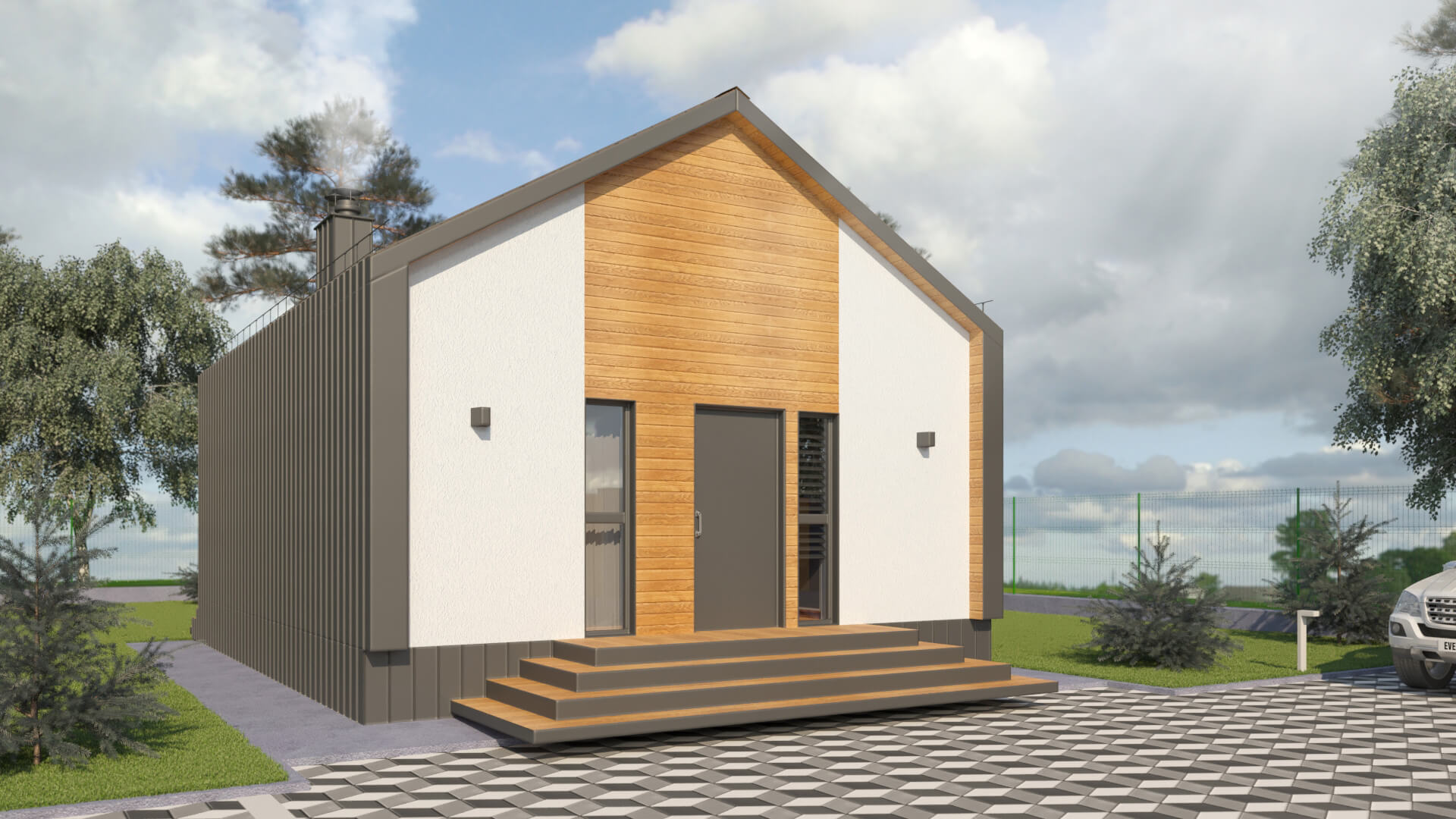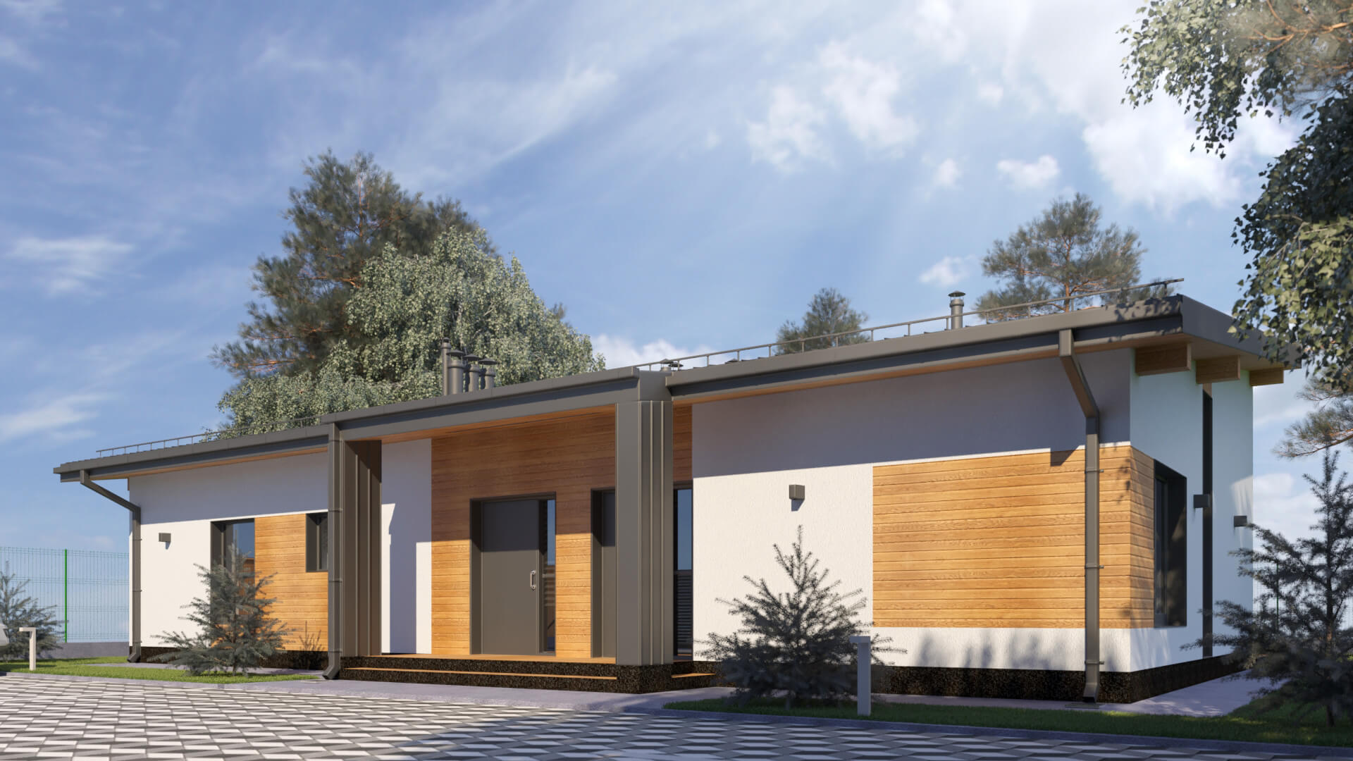 Одноэтажный дом по европейским стандартам архитектуры, кубической формы с панорамным остеклением, со «вторым светом» в зоне гостиной. Размеры дома настолько универсальны, что позволяют легко перепланировать внутреннее пространство под любой состав семьи от 3 до 6 человек.