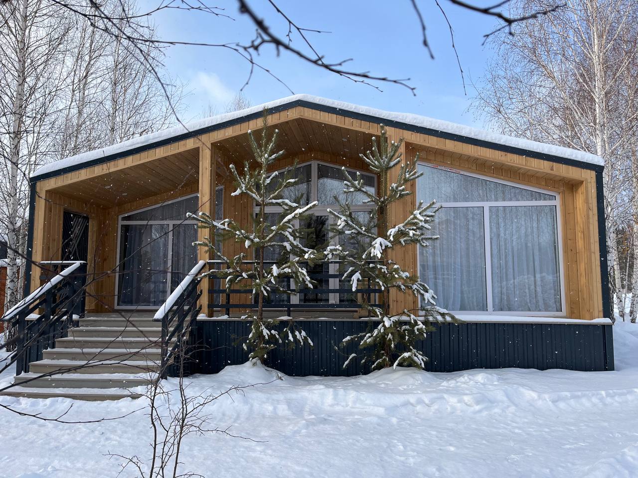 Одноэтажный дом с современной архитектурой кровли и панорамным остеклением в зоне гостиной с большими комнатами и террасами. Предназначен для проживания семьи из 4-6 человек.